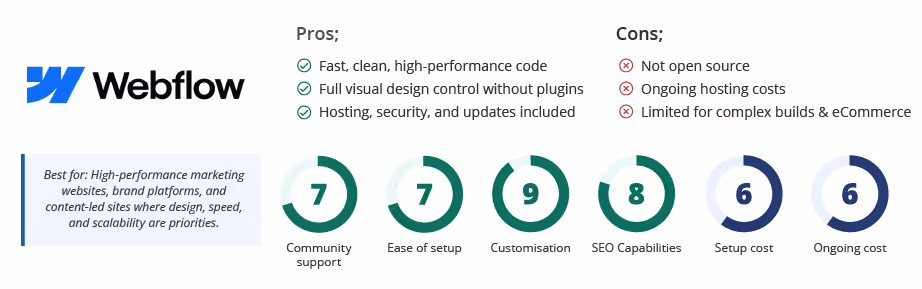 Webflow isn’t the right fit for every build. For complex eCommerce or advanced custom logic, another platform may be more appropriate. For businesses that value speed, design flexibility, and a stable editing experience, it is a strong and dependable option.